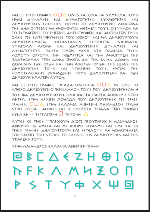 ΤΑ ΤΡΙΑ ΜΕΡΗ ΤΗΣ ΕΛΛΑΝΙΑΣ ΑΙΘΕΡΙΚΗΣ ΓΡΑΦΗΣ ΜΑΙΑΝΔΡΟΥ ΕΙΝΑΙ Η ΚΥΚΛΙΚΗ, Η ΤΕΤΡΑΓΩΝΗ ΚΑΙ Η ΤΡΙΓΩΝΗ - ΡΟΜΒΙΚΗ ΔΥΟ ΤΡΙΓΩΝΩΝ. ΚΑΙ ΟΙ ΤΡΕΙΣ ΑΥΤΕΣ ΜΟΝΑΔΙΚΕΣ ΓΡΑΦΙΚΕΣ ΑΠΟΤΥΠΩΣΕΙΣ ΤΩΝ 27 ΣΥΜΒΟΛΩΝ ΤΟΥ ΧΑΡΤΗ ΤΗΣ ΔΗΜΙΟΥΡΓΙΑΣ ΤΩΝ ΑΛΦΑ ΚΑΙ ΤΟΥ ωΜΕΓΑ ΑΝΗΚΟΥΝ ΚΑΙ ΕΙΝΑΙ ΜΕΡΟΣ ΚΑΙ ΑΝΑΠΟΣΠΑΣΤΟ ΤΜΗΜΑ, ΩΣ ΤΡΙΑΔΑ ΜΟΝΑΔΑ, ΤΗΣ ΕΛΛΑΝΙΑΣ ΑΛΗΘΙΝΗΣ ΜΟΝΑΔΙΚΗΣ ΜΑΙΑΝΔΡΟΣ ΑΙΘΕΡΙΚΗΣ ΓΡΑΦΗΣ.